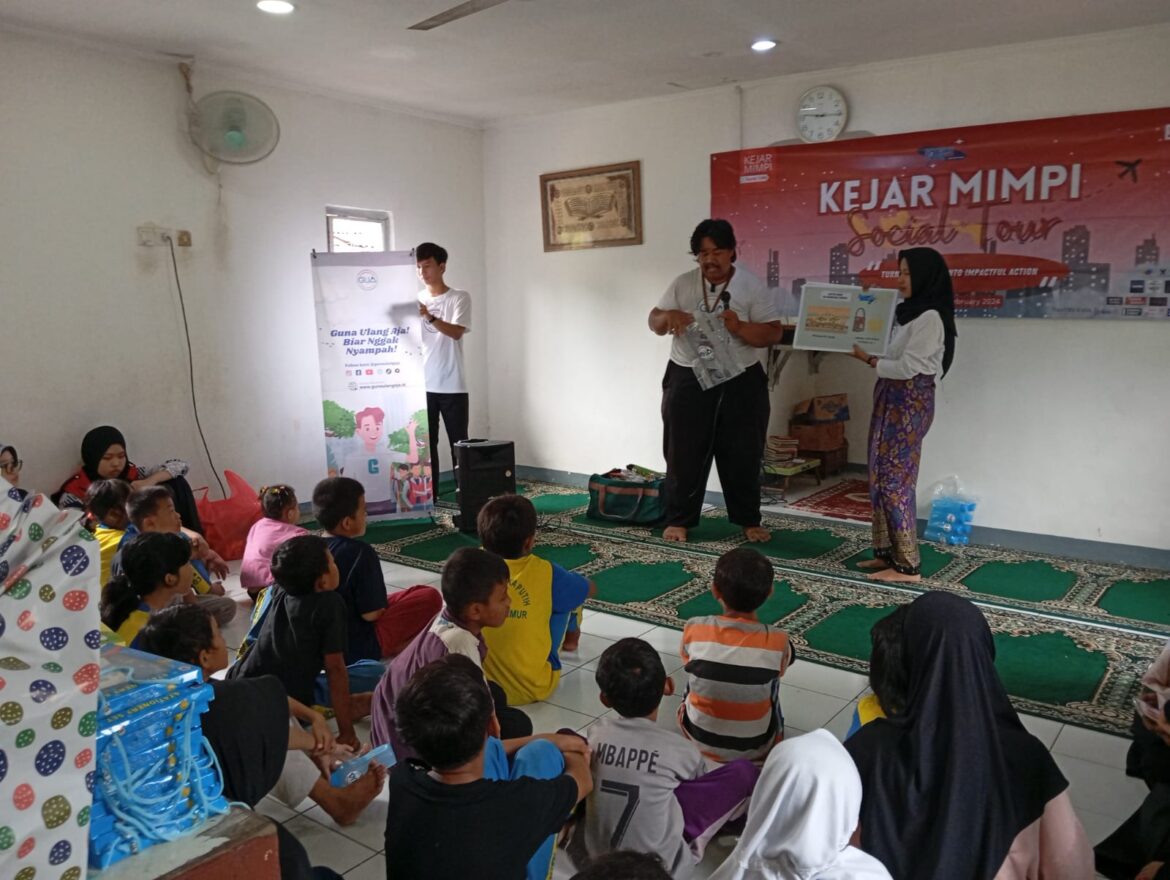envira.id, Tangsel -Sebanyak 25 anak-anak asal Kampung Sawah, Ciputat Tangerang Selatan pagi itu terlihat bersuka cita. Baju mereka warna-warni. Sebelum mendapatkan edukasi tentang lingkungan, mereka diajak bersenam ria. Selanjutnya, istirahat sejenak lalu mereka siap mendapatkan pengetahuan tentang lingkungan dari mini Project “Kejar Mimpi Tangerang Selatan” bekerja sama dengan Komunitas Guna Ulang Aja (GUA).